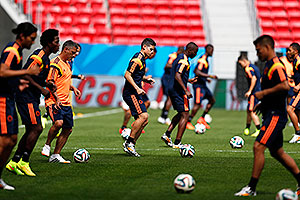 Fortaleza: La Selección colombiana de Fútbol hizo su primera práctica en Fortaleza, con miras a definir su estrategia para enfrentar a Brasil, este viernes,en el partido por los Cuartos de Final del mundial. Los dirigidos por el profesor José Pekerman realizaron trabajos a puerta cerrada durante noventa minutos, en el Estadio de Atletismo de la ciudad.